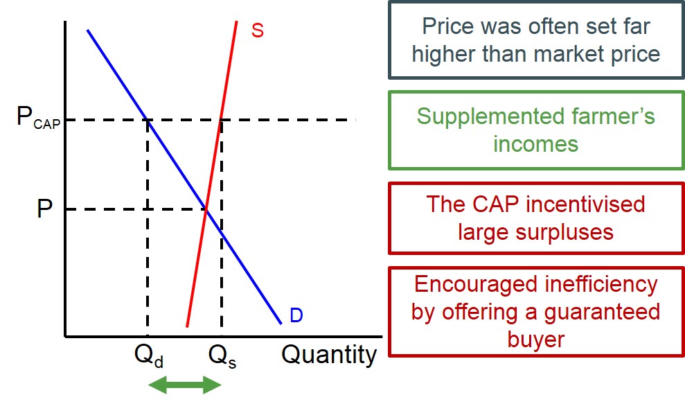 It works by guaranteeing farmers a given price for their agricutltural products and therefore removes any uncertainty around and instability around crop prices. It would work in the same way as a buffer stcok scheme should work. The EU would buy goods from EU farmers at the high price if their was oversupply in the market. The amount they would buy wold be equal to (Qs-Qd). This price was often far higher than the market price so that it could supplement farmer's incomes during uncertain times. However it did incentivise farmers to over-produce to receive a higher income from the EU government and therefore was very inefficient. The process of the CAP is shown below in the diagram.