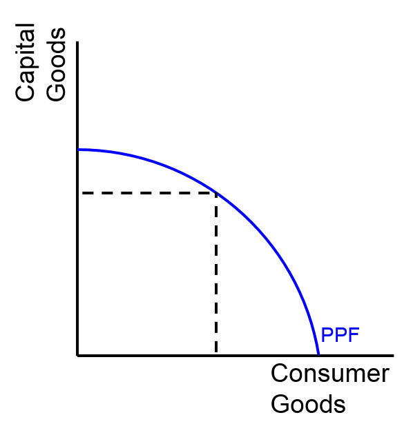 The diagram below shows an economy that is positioned to produce either capital goods or consumer goods and because capital goods have a bigger influence on economic growth, this economy is slanted towards producing more capital goods compared to consumer goods. But, it is still positioned on the PPF and therefore is fully utilising all the resources available in the economy.