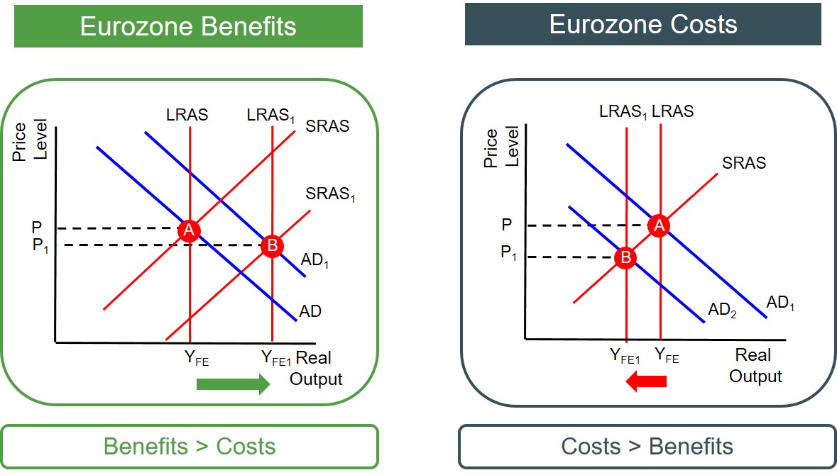 The key question when analysing a currency union like the Eurozone is determining whether becoming a member of this type of union is beneficial or costly for a particular country. But it almost impossible theoretically to say whether a country joining a single currency will be made better-off or worse-off. As each country is in a different position in terms of trading patterns and exposed to different types of economic shocks. Therefore, in an exam situation when evaluating the decision of a country to join a single currency, the focus should be on what economic conditions need to satisfied for membership of a single currency to be optimal and what conditions need to be present for membership to be a disaster for a country.