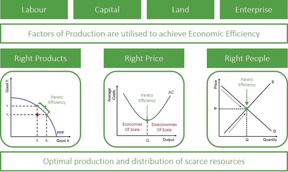 When referring to economic efficiency it is concerned with how well scarce resources in the economy are being allocated in order to maximise social welfare by meeting the persistently changing needs and wants of economic agents in the economy. Typically, resources are allocated optimally if markets work well via the price mechanism.