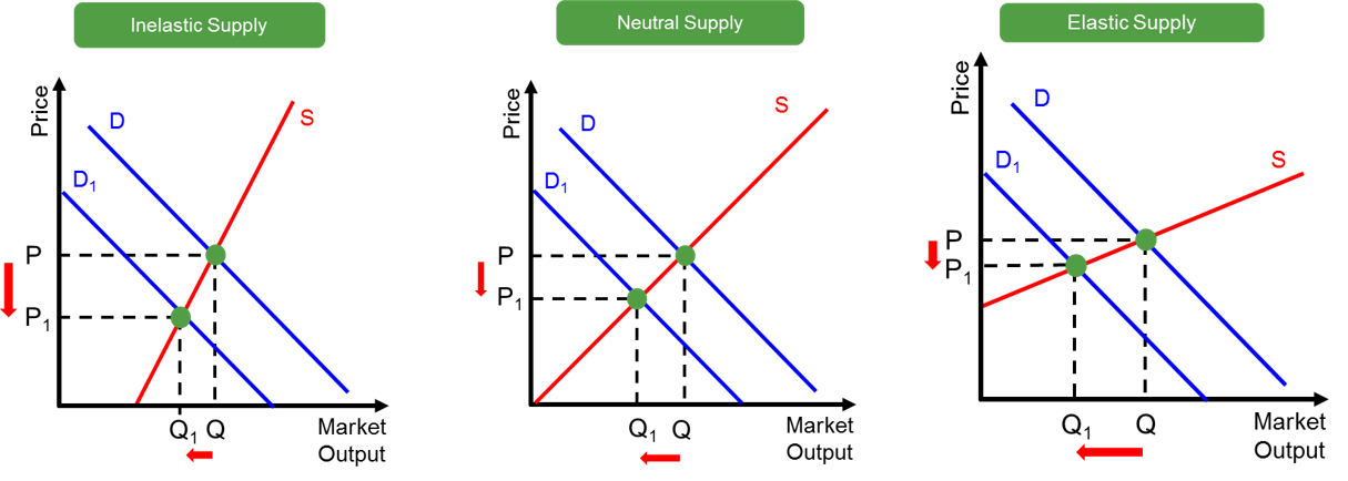 In this case, there is an inwards demand curve shift and this creates pressure for the price to fall to P1 as a result of excess supply. This is the case regardless of the elasticity of the supply curve. However, as is shown in the diagrams, the more inelastic the supply curve the greater the price fall in the market. The opposite process would occur if the demand curve outwardly shifts.