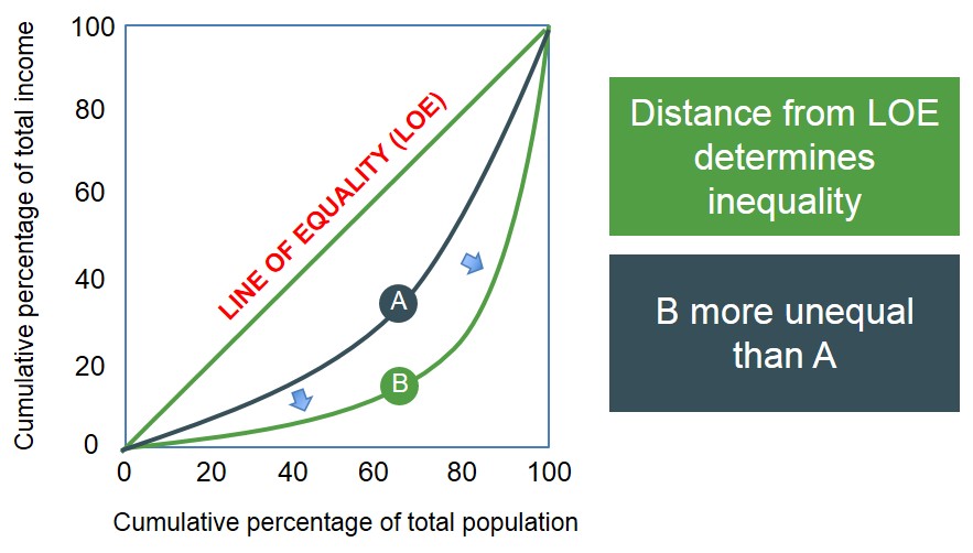 One of the most commonly used methods of measuring the income distribution for a country is to analyse the Lorenz Curve. Below is a diagram which illustrates the income distribution for a country worsening as the Lorenz Curve has shifted out to B. This means that a bigger fraction of income is held by a smaller percentage of people i.e. the very wealthy. Likewise it is the opposite for an inwards shift of the curve. From this measure the Gini Coefficient can be derived, placing the measure of the income inequality of a country into one single figure.