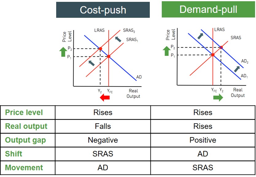 Both of these types of inflation push the price level up as a result of a macroeconomic disequilibrium and this in turn creates an output gap. Therefore in an exam question it is important to evaluate what is the cause of inflation in an economy and from that you can assess how large an impact this factor has had on the inflation rate i.e. has it caused the inflation rate to increase rapidly or insignificantly. This is important as from this initial evaluation point you can argue and discuss the possible economic policies that may be implemented in response to the inflation rate rising too quickly, in order to protect a country's competitiveness.