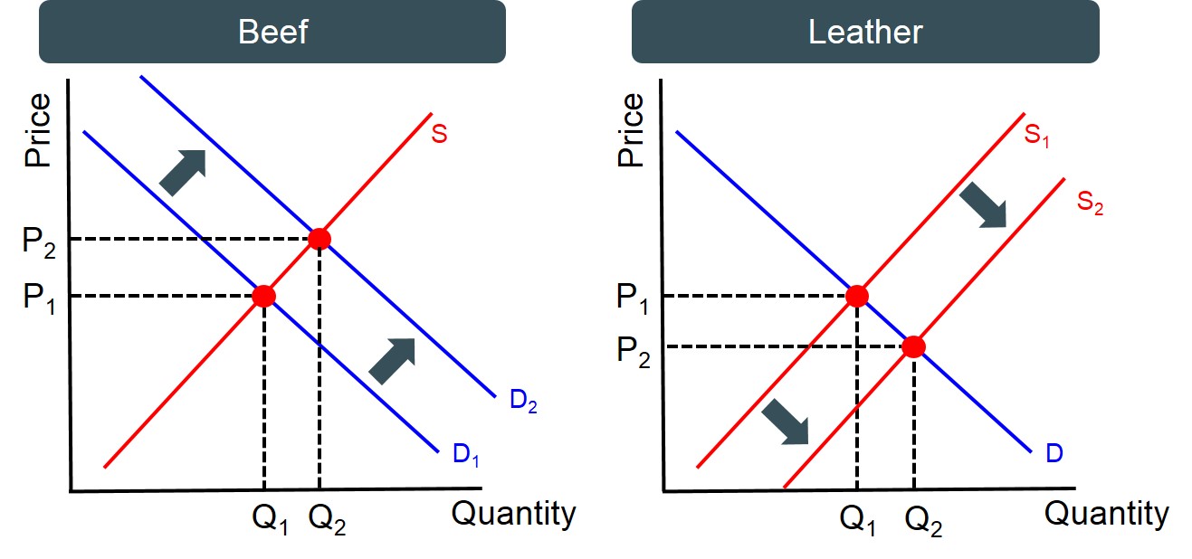 Below is a set of diagrams to illustrate joint supply in a demand and supply framework. In this instance an increase in demand for beef, raises the price of beef and as a result increases the supply if beef due to higher profit incentives. If more beef is produced then this should increase the supply of leather as leather is produced from beef. Therefore beef and leather are in joint supply.
