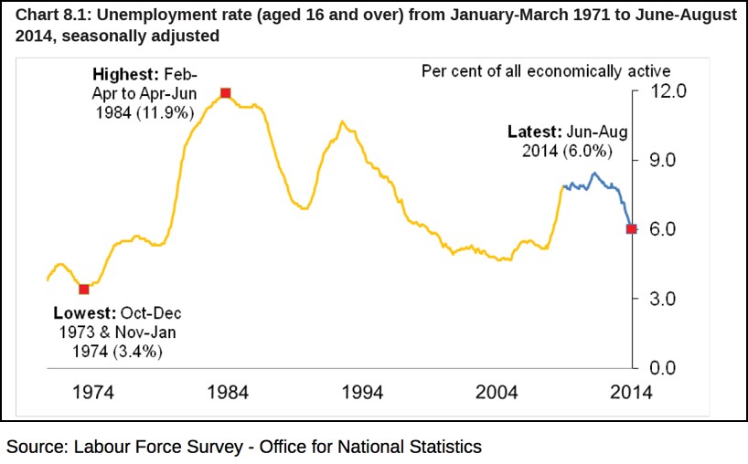 Below is the LFS measure of the UK unemployment rate from 1971-2014.