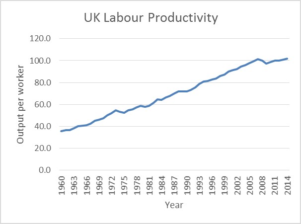 Below is a diagram to show the growth in UK labour productivity since 1960. It has been growing close to a linear trend.