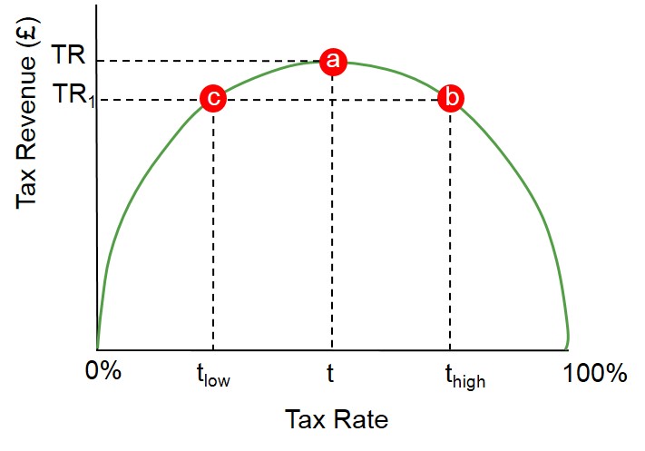 A curve showing how the amount of tax raised varies with the percentage rate of tax levied. It shows that although there is a positive relationship between the tax rate and revenue at low percentage rates of tax, the tax raised ultimately reduces when the percentage rate starts to rise to high levels, as this discourages workers from providing additional labour or encourages individuals to avoid paying the tax.