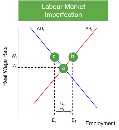 Aspects of the labour market which causes the prevailing wage rate to lie above or below the equilibrium wage rate. As a result markets will fail to achieve efficient outcomes.