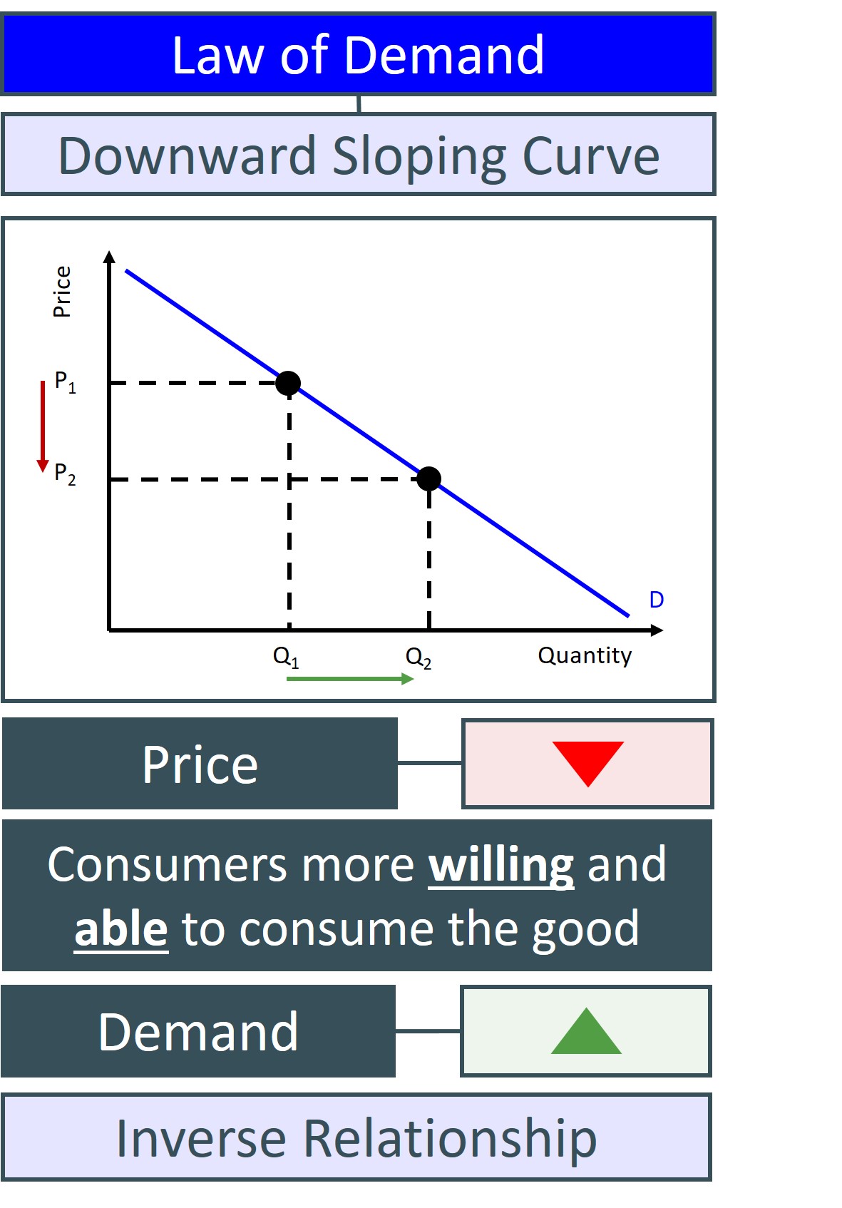 This is the theoretical explanation of why the demand curve for most goods and services is downward sloping i.e. an inverse relationship between the price of a good and the quantity demanded of that good.