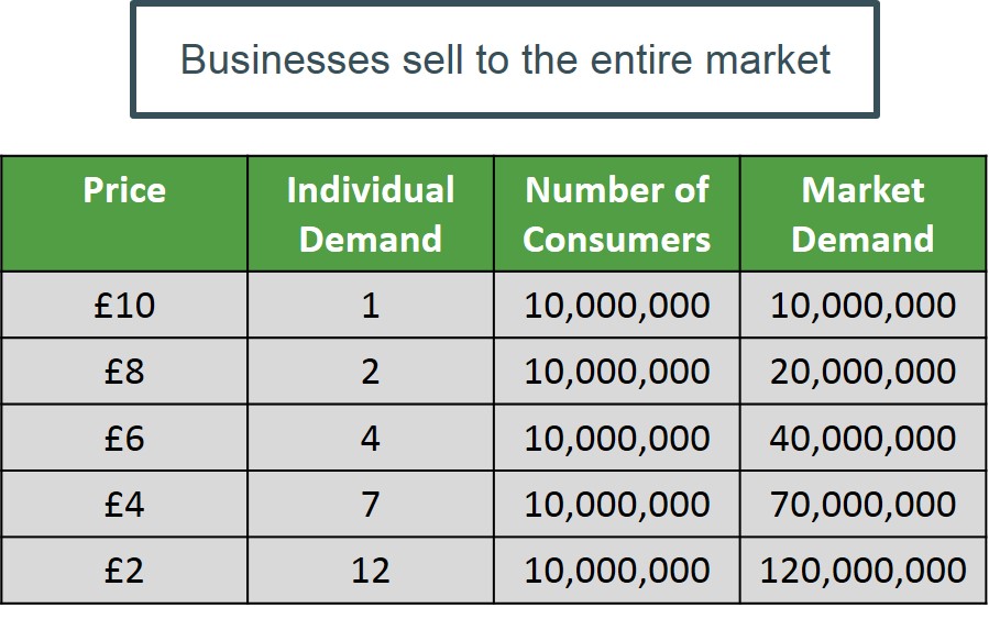 Below is an example of how to derive the market demand curve. At every individual price it needs to be calculated how many consumers are willing to buy a certain amount of goods. This is shown in the table below.