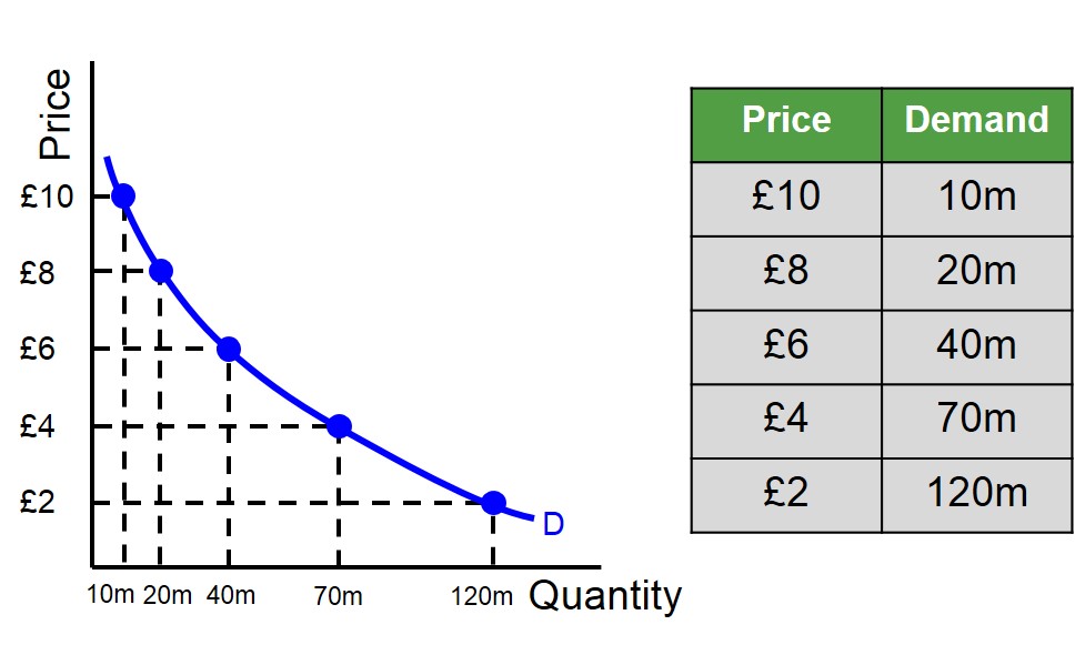 Below is the illustration of the market demand curve using the data in the table. As can be seen from the graph, the demand curve for the market has the same basic downward-sloping shape as the individual demand curve, to signify that the law of demand still holds for the market as it does for the individual demand curves.