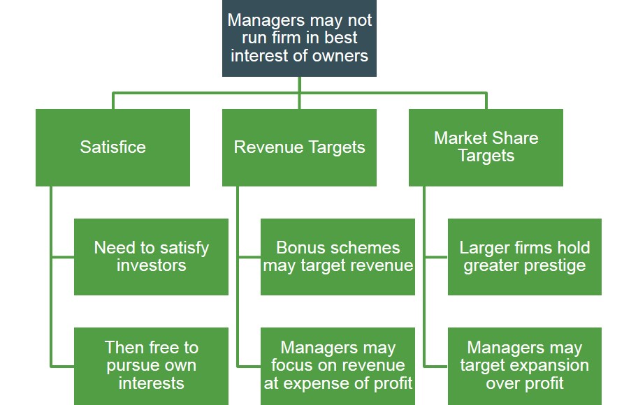 Below is a breakdown of this type of problem relating to shareholders and managers. In this case the manager has three main objectives to achieve alongside maximising return for shareholders. For instance it may be that managers try to help the firm acquire as much market share as possible in order to make the firm grow and expand to meet those customers. This is becaue firms that have exponentially grown are often the firms that are most impressive from a manager's performance persepctive and therefore it will put the manager's value higher from not just within the company but from external companies. Therefore they may decide to reinvest majority of the profits the company makes to help fuel expansion rather than paying higher dividends to shareholders.