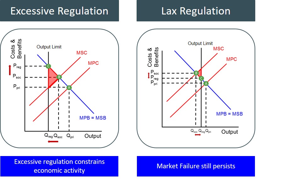 However, the ability of the government to be able to identify this social optimum point (B) in reality is much more complex and challenging. Therefore, the government has to estimate this point and this can lead to the wrong level of regulation being imposed on the market. They may place too much regulation on the market worsening the outcome prior to intervention and move the market from one extreme to another i.e. the good goes from being over-provided to under-provided. In this case the red tape from the regulation has become excessive and places unnecessary restrictions on firms. This raises their costs, reduces their margins and reduces their overall level of competitiveness. This backs up the free marketeer argument regarding regulation.