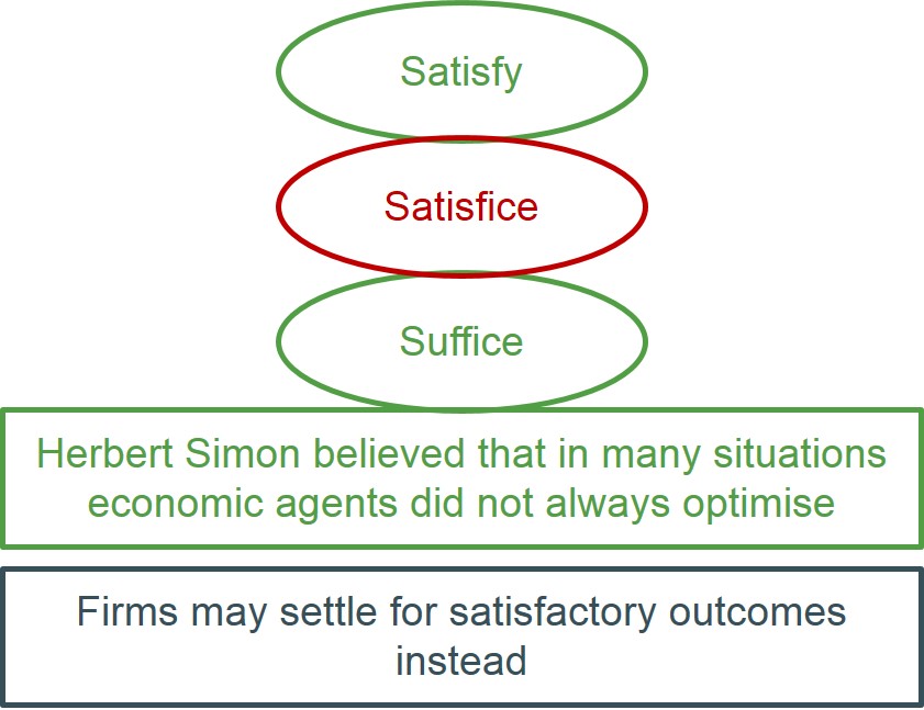 Below is an illustration that satisficing always leads to a choice which lies somewhere between a satisfying outcome and one which will suffice i.e. making the best decision a person can make. For instance, an individual wishing to purchase a high quality good with a low price will often find it very difficult to achieve this aim and therefore will often have to buy a high quality product at a price that will suffice or buy a lower quality version of the product that is still satisfactory.