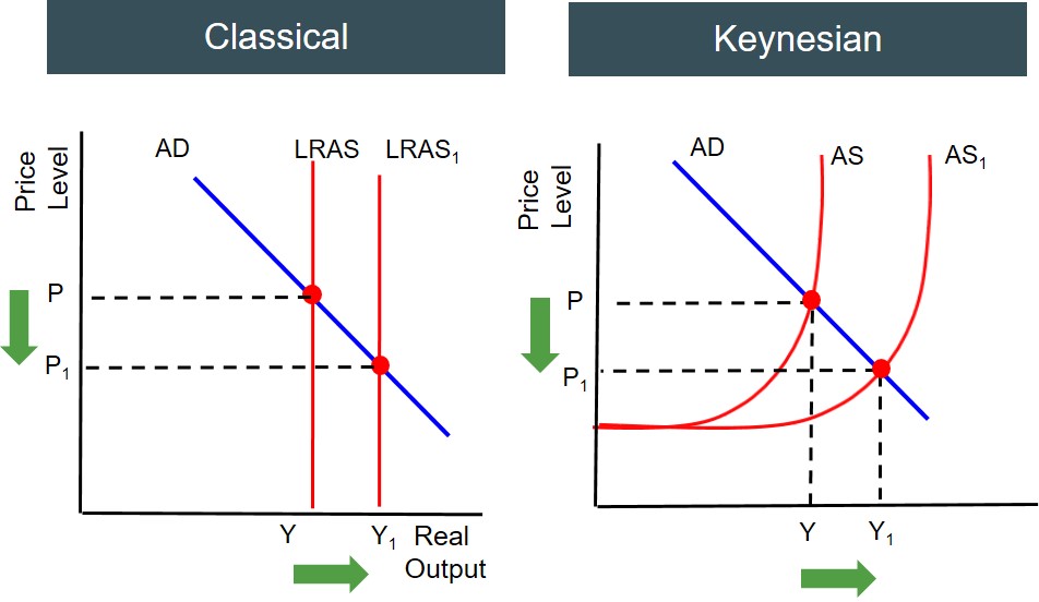 These initiatives if implemented in the economy, will create an expansion in the supply curve in the long-run, from a classical perspective this will be an outwards LRAS curve shift and in the Keynesian case it will be an expansion in the Keynesian aggregate supply curve.