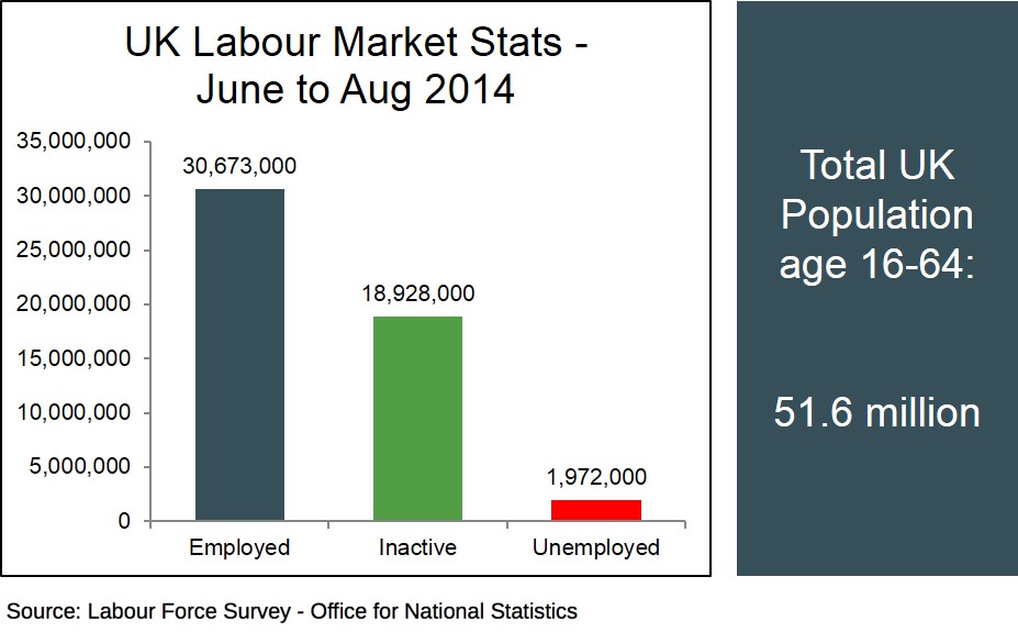 Below is a breakdown of the amount of workers who were classed as employed, unemployed or outside the labour force and economically inactive in the UK from June to August 2014. This measurement is taken using the government's Labour Force Survey.
