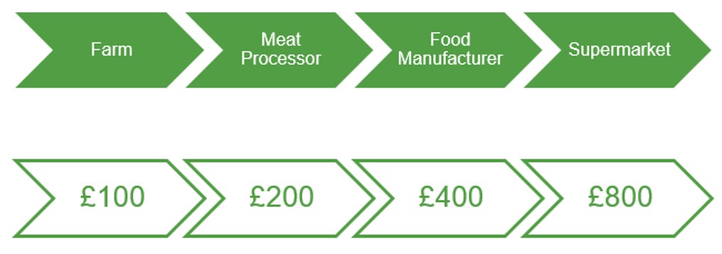 Below is an example of how value added works in the production of food that eventually gets sold in supermarkets. The farm produces the food with a value of £100. The food then gets sent to the meat processor which adds another £100 on to the value taking it to £200. This processed meat then gets sent to the food manufacturers who package and brand the product adding another £200 to the value taking it to £400. Finally the supermarket buys the food from the food manufacturer and tsocks it on their shelves and this takes the final value to £800.