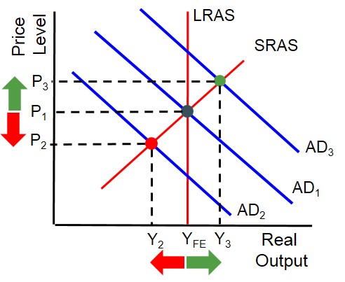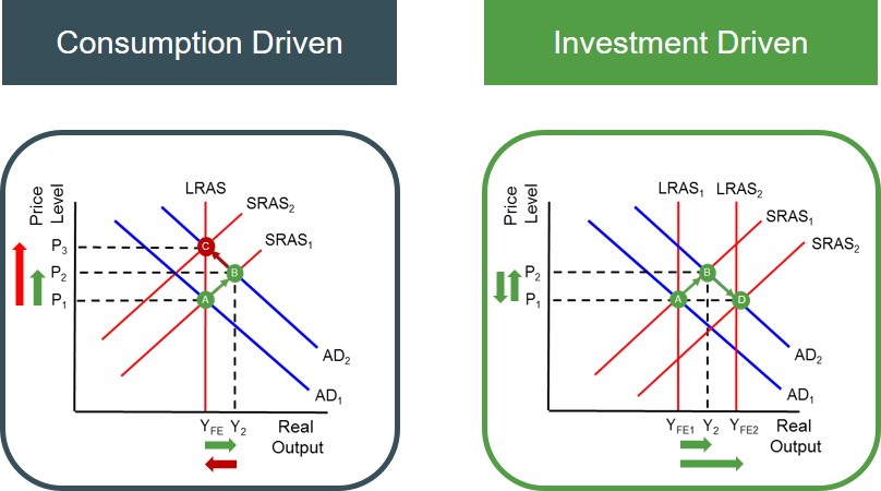 However, when evaluating this type of inflation it is important to understand the main cause of the positive AD shift. This is because if the AD shift was caused by increased consumption brought on by higher consumer confidence, then it is likely to create an inflationary spiral, in which real output remains unchanged but the price level increases significantly. This is essentially an inflationary movement up the LRAS curve without any real gains for economic agents. However, if the AD curve shift was brought about through higher investment, this is likely to have strong productivity links to the economy (e.g. increase in rate of capital accumulation). As a result, it can create pressure for the LRAS curve to outwardly shift and the economy goes through a period of disinflationary growth. So it is important to consider what factor has driven the demand-pull inflation to evaluate its impact on the performance of the economy.