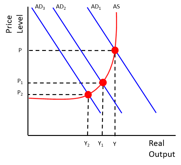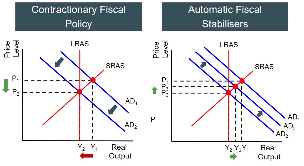 On the other hand, if the government runs a contractionary fiscal policy, this should theoretically decrease aggregate demand quite significantly as a result of the government spending component of AD decreasing or lower consumption brought on by lower disposable income (Y-T). But taking into account the role of automatic fiscal stabilisers, the contraction in AD (downside in reduction of output, employment and the price level) from this type of fiscal policy will be constrained and the aggregate demand curve shift may not be as significant i.e. shifts to AD3 rather than AD2.