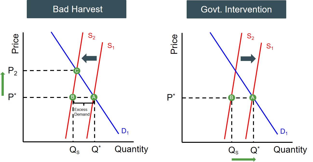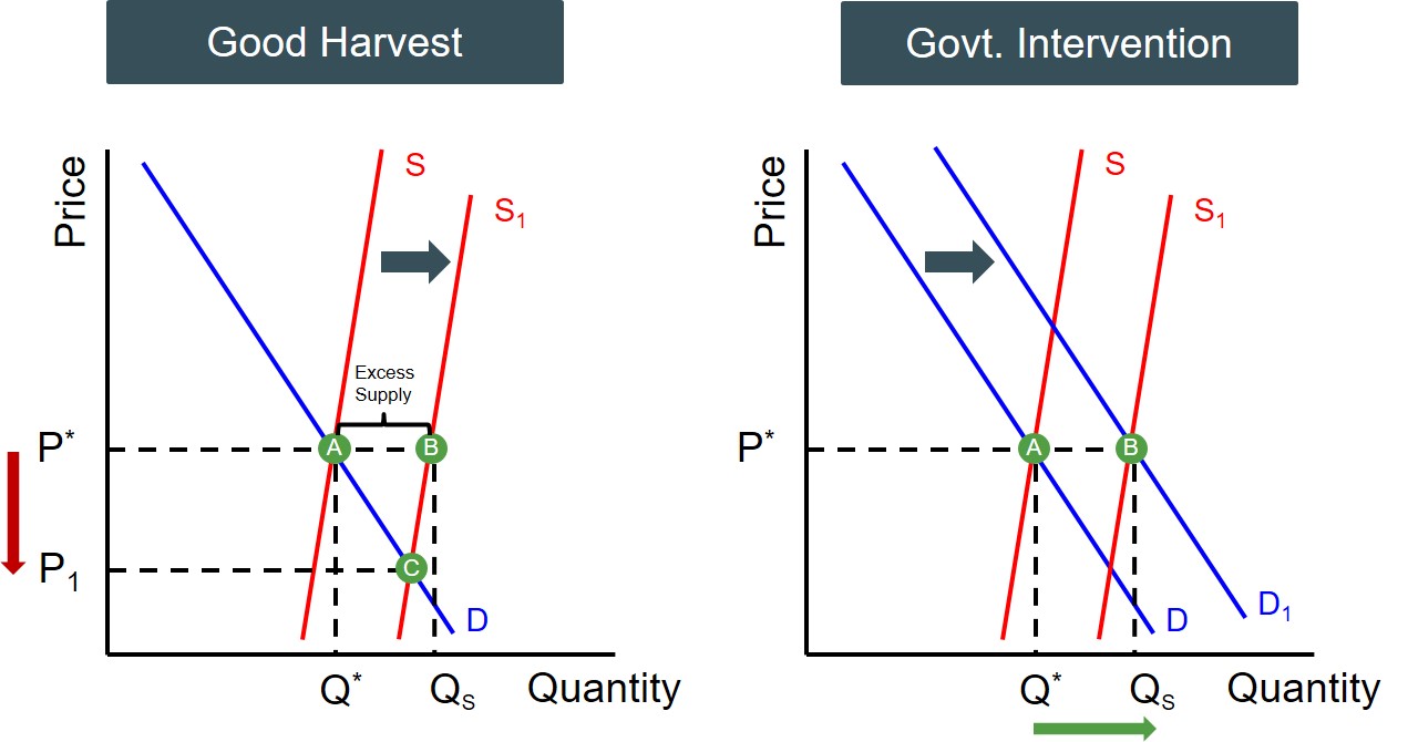If the government has the capability to store the surplus stocks effectively then this stock gets resold to the farmers during a bad harvest when supply is short and the supply curve shifts to S2. This is because without farmers being resold the surplus stock there would be excess demand in the market equal to (Q* - QS) and this creates upward pressure on prices to change to P2. The extra stock sold to farmers shifts the supply curve back to its original position (S1) and restores stability to the price of this product. The severity of the bad harvest depends on how much stock the government decides to sell back.