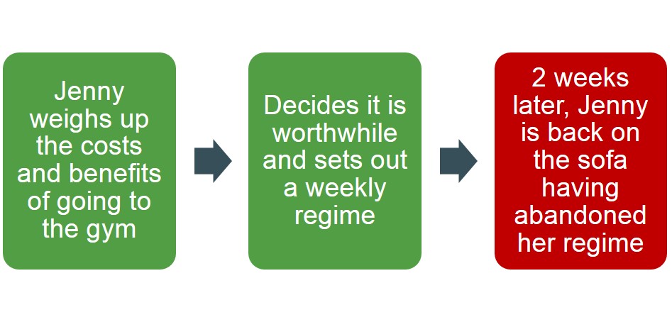 Below is an example of how this behavioural economics theory comes about. In this instancet Jenny has slipped out of her weekly regime for going to the gym and we have to assess whether she has chosen to stop this regime herself or whether it is a lack of self-control and discipline to keep the regime going.