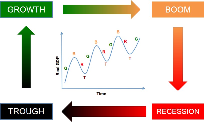 Although the real economy's economic cycle does not operate as smoothly as depicted in the graph, the general pattern seen is similar. The depth and duration of the different cycle phases will largely depend on the effectiveness of fiscal and monetary policies implemented by the government and central bank. Government's are not always prepared to pursue the fiscal and monetary policy that is necessary to control economic cycles. This is often the cause of extreme and prolonged downturns and the need to obtain bailout funding.